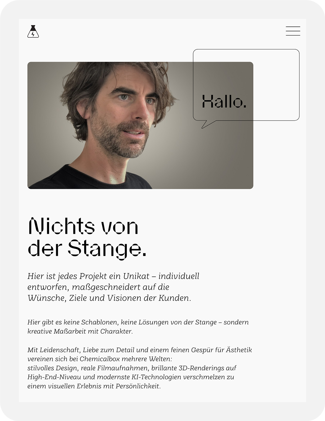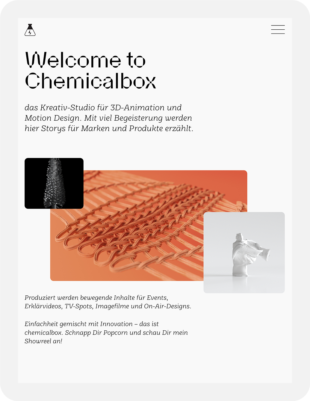 Chemicalbox est un studio créatif spécialisé dans l’animation 3D et le motion design situé à Nidau. Tout tourne autour de l’image animée, qu’il s’agisse de motion design, d’animations 3D, de visualisations architecturales et de produits, de vidéos explicatives ou d’effets visuels pour la télévision et le cinéma.